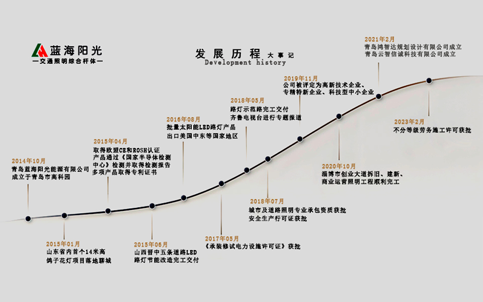 公司擁有“藍海陽光”“華智光”注冊商標、多項國家專利技術和軟件著作。公司先后承擔了山西晉中市全部道路路燈改造工程、云南省西雙版納州節能合同管理工程、青島市交通運輸局太陽能路燈、新疆昌吉州農村扶貧工程、淄博市源泉鎮特色小鎮照明工程、聊城經濟技術開區多條景觀道路等重大工程,特別是2018上合峰會青島城陽區長城南路智慧燈桿示范項目,是山東省智慧路燈示范項目,并獲得了“青島市上合峰會百佳項目”光榮稱號,齊魯電視臺對此項目進行了綜合報道。